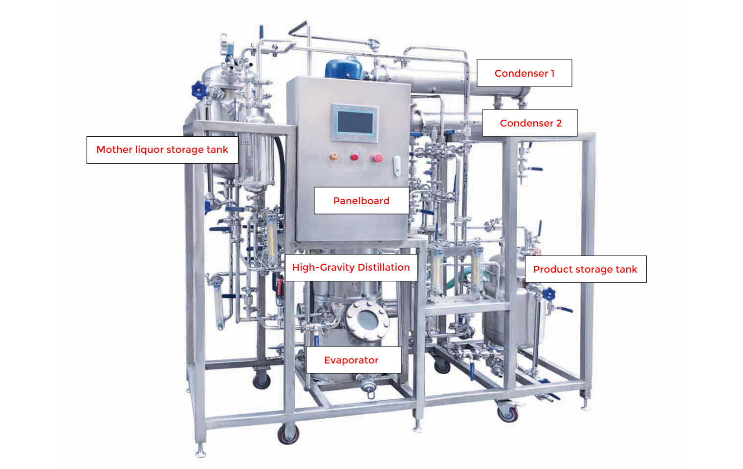 Прототип роторной дистилляции состоит из нескольких систем, в том числе испаритель с электрическим нагреванием, дистилляционный блок, резервуар из сырья, конденсатор и резервуар готового продукта. Эта система предназначена для восстановления и очистки органических растворителей, таких как этанол, метанол, ацетон, этилацетат, ацетонитрил, тетрагидрофуран, дихлорметан, DMF, DMSO, толуол, изопропанол и трт-бутанол. После начала он быстро извлекает и очищает конечный продукт.